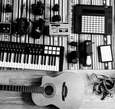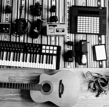 Mijn eigen songs. Door de jaren heen heb ik verschillende nummers geschreven. Zo nu en dan laat ik er eentje los op de wereld. Het begon allemaal met een windos 98 pc en een toys'r'us keyboard. Tegenwoordig vind ik mijzelf tussen gitaren, shakers, midikeyboards, grooveboxen en ga zo maar door.